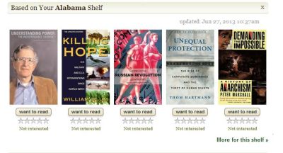 Based on my “Alabama” shelf, it is recommending I read Understanding Power, by Noam Chomsky; Killing Hope, a history of CIA operations; a history of the Russian Revolution; a work detailing how human rights have been destroyed in the rise of corporate power; and a history of anarchism.