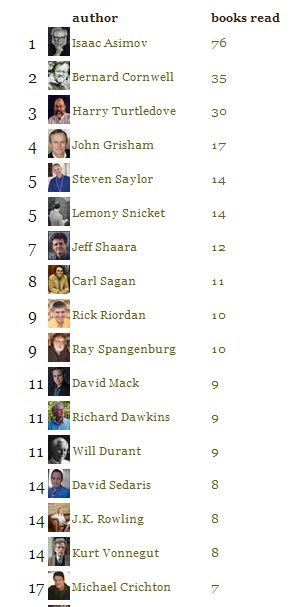 Speaking of authors, I recently noticed that Goodreads will display a list of your most-read authors on command. My results aren’t too surprising, and I’m happy to see that dear Doctor Asimov holds the #1 spot with nary a challenger in sight.