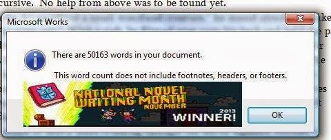 Is it weird that I was more excited to hit 45,000 words than to actually ‘win’ NaNoWriMo? I suppose that’s because when I hit 45,000, it was the evening I added a few days’ work from different files into the body of the text, and the word-count soared 10,000+ with one Ctrl-V and I realized I was going to do it, there were only a few days left and the odds weren’t good that something could derail me completely. The lesson I learned from NaNoWriMo is that I should take a audio recorder out with me on my morning walks and jogs, because that’s when my brain starts being productive. It’s terribly hard to write notes while running, especially when you’re dodging puppies at the same time.
