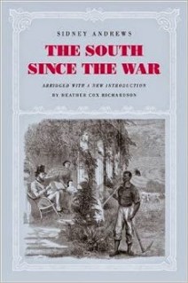 In the autumn of 1865, as the dust and ashes were still settling over the graves of the Union and southern dead,  an Illinois journalist decided to spend the season exploring the land of prodigal brothers and late enemies.   His The South Since the War combines a travel diary with obsessive political journalism, recording the proceedings of three state conventions (the Carolinas and Georgia) as well as a conference of freedmen.  He is, upon completion, not a fan — disappointed  in shabby hotels, defunct railroads, and the fact that the war has not given the southerners a thirst to transform themselves into New Englanders.  They remain a people apart — ruined, owing to having been beaten in the fields, but still defiant.