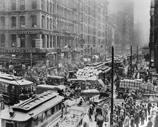 The commericial life of the city would involve political meddling, however. The attempt of an entire a metropolitan area to conduct its shopping, banking, and theater-going in one relatively small area lead to chronic congestion. This is a congestion beyond levels appreciable by Americans today, even those who sit in LA traffic jams. Photos show pedestrians shuffling down sidewalks cheek-to-jowl, trolleys crammed like sardines and the streets utterly filled with these as well as horse carriages, rag-wagons, and delivery carts. That traffic was the economic life of the city, but the thought of competing in such crowds could fill some with despair: was it really worth it? What it was worth is a question pursued by city governments who attempted to find some better way of transportation in and to the city center, either elevated or underground train lines. (Trolleys were nice, of course, but the glorious chaos of city streets meant they were frequently slowed and altogether blocked by pedestrians and carts.) Such prospects were expensive undertakings for private enterprise, and required considerably more politcking — getting permissions from landowners to dig under them, for instance — and so city governments themselves often had to take on the burden of attempting them. The el-lines were not altogether popular, casting a constant gloom over the streets and treating pedestrians to showers of sparks and cinders. Subways were much more expensive and time-consuming to build, a daunting fact given periodic economic downswings, but little by little the major cities edged into using them.