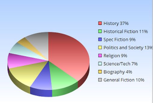 Big year for history, obviously. This chart doesn’t include everything, just the major categories. Speculative fiction includes science fiction, alt-history, horror, and (ordinarily) fantasy, but I didn’t include the Narnia books given their size.