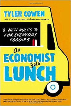 Imagine going out to eat with someone who really likes to talk about food, and imagine that this person is also an economist. That’s An Economist Gets Lunch, three hundred pages of very excited chatter about food culture and markets across the world.  There’s no argument to be had, just sheer enthusiasm for the subject at hand, one that I had to be wary about reading because it kept giving me the munchies.   Cowan’s concoction is a weird mix of  culinary discussion, economics, world travel, and history.  He doesn’t produce a set of rules: there’s a principle guideline, followed by many little bits of advice. The key principle is this:  food is a product of supply and demand, so look for options where the supplies are fresh, suppliers are creative, and the customers are demanding. The implications of this are broader than “avoid fast food”.   Cheap doesn’t necessarily mean bad;  most of Cowan’s favorite culinary experiences happen while traveling in less-industrialized areas of Mexico,  Nicaragua, Sicily, Thailand (he’s very well traveled, this fellow) and other places. Because food markets are predominately local there, supplies tend to be fresh and the creators specialists in their region’s offerings. The price is dirt cheap, compared to the cities.  A high price tag doesn’t indicate that the food is exquisite, either: often it carries with it the money sunk into creating a luxurious restaurant environment, complete with superfluous staff like valets, or the high rents.Cowan especially disdains the city centers of touristy areas like Paris and Rome. You want good Italian food, hop on a train and head for the back country, he urges. And French? Try Japan.