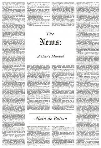 Alain de Botton is a marvelous perceiver of things, deeply introspective and always unexpectedly funny. The value in reading The News, which is at is says a user’s manual, is that is opens eyes to the wearisome triviality burped up by the news. He never addresses the barrage of news and updates from television and our smartphones, and his ideals for some purposeful recrafting of the news would be even harder to apply to them. His essential criticism, however, that news in its present form is ‘bad’ for us, dispiriting if swallowed unthinkingly, applies across mediums.