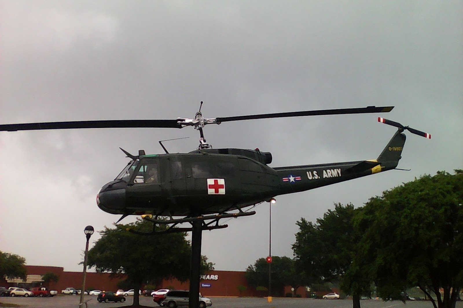 Turns out, near the University Mall (across the street from my destination) is a Veterans Memorial Park, with various pieces of military equipment from different services parked there, including a M60 tank, a Huey, a A-7 Corsair, a Willys jeep, and two pieces of artillery (one land-based, one naval). I’ve never been near a tank, so despite a downpour, I happily jumped out of the car with umbrella in hand to go stand and stare at it. According to a plaque, a military hospital once stood on the site, presumably now covered by the mall’s footprint. I took some photos with my phone; click for larger versions.