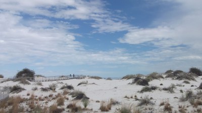 Beyond the boardwalk, the paved road disappeared,but a compressed path extended far out into the expanse. I decided to hike along the road, occasionally leaving it to wander midst the dunes themselves. Even under a partially cloudy sky, the dunes were blindingly white; I wore sunglasses and could not see otherwise.