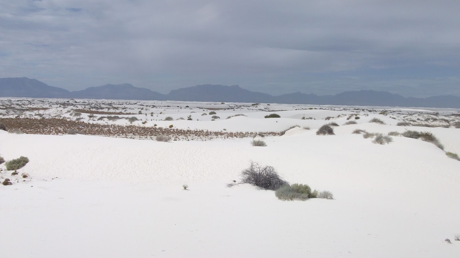 I could see White Sands while approaching Alamogordo, a stretch beneath the mountains that gleamed like the ocean. When I arrived IN Alamogordo and saw the space museum, I wondered if somehow I’d missed the turnoff to the park itself. Instructions from a local assured me that I was on the right road, and once outside of town signs appeared. Soon, white hills overgrown with vegetation appeared, and behind them the entrance to the park. The park’s sheer scale makes a driving tour most practicable, though I pulled over as soon as the pavement gave way to compressed sand. I can sing many praises of my rental, that Kia Rio, but driving on sand is not among its strengths. I felt like I had fallen into the gears of a machine. A large parking area two miles into the drive provides a marginally elevated boardwalk into the middle of the dunes, with informational signs along the way expalining the science of the Sands’ formation, and the life that persisted there.
