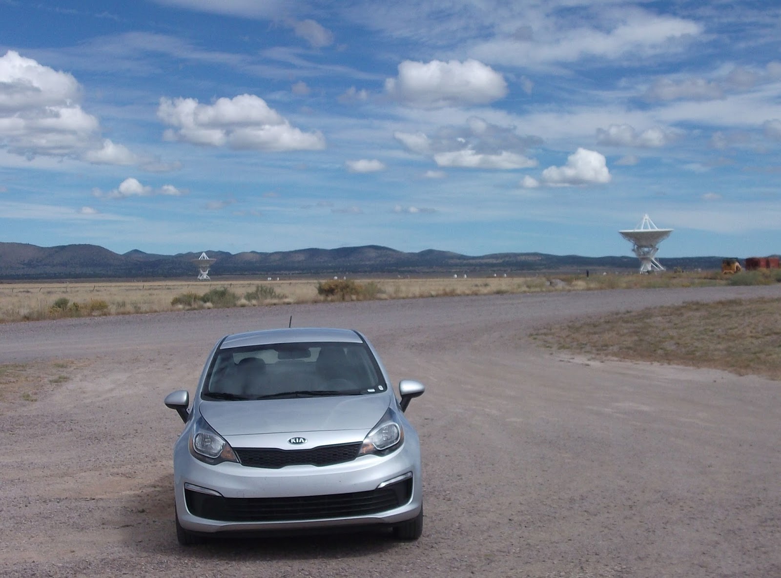 At Socorro, I stopped at a gas station to put a fume or two in the tank (a miracle, that little Kia Rio) and confirmed my directions. After buying a Crystal Pepsi for nostalgia’s sake (and discarding it for taste’s sake), I headed into the Socorro countryside. I found there even more beautiful country. It was….the West. Not the southwest, but the west. There were rolling hills dotted with shrubbish trees, vast fields of cows, and mountains in the distance. It was country beauty, but at a grander scale than Alabama pine forests would allow me to see — and soon the plains became even more pleasant to the eye,because they had radar dishes in them!