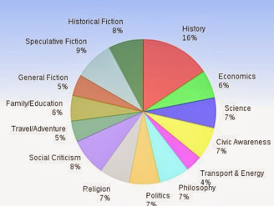 History, as usual, gets the lion’s share — still, not as much as last year’s 37%. My reading was intentionally more diverse this year, and accordingly science made a strong showing — with more reads last year than in the previous two yeas combined. When I began the year I wanted to model it after 2013, which was terrific in both terms of quality of books and in the variety of topics I considered. Just look at the spread!
