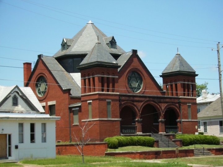 Temple Mishkan, testament to a Jewish community that was once considerable. In the late 19th century, Jewish merchants lined Broad Street. The interior of the Temple is unusual for having stained-glass windows depicting David and Esther; images of people are not common in Jewish houses of worship.