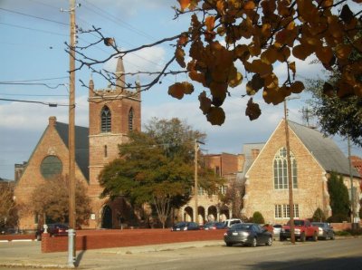 On the left there's the tower for St. Paul's; in the center are First Baptist and Church Street Methodist; and on the far right virtually cut off is the belltower of First Presby, also known as Cornerstone Presby.