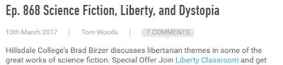 On Monday, Tom Woods sat down with historian Brad Birzer (American Cicero)  to talk about early science fiction and to discuss the political themes explored by Thomas More, George Orwell, and C.S. Lewis. In general,  Woods and Birzers appraise SF as anti-authoritarian and subversive.  Birzer opened by mentioning that Catholic and Jewish authors played a large part in early science fiction in part because they were discouraged or prevented from participating in ‘mainstream’ culture; publishing outside the New England/WASP stronghold also allowed them to be critical voices.    The discussion doesn’t go past Orwell,  which is too bad because Bob Heinlein’s Moon is a Harsh Mistress is an obvious example of libertarian themes in SF.