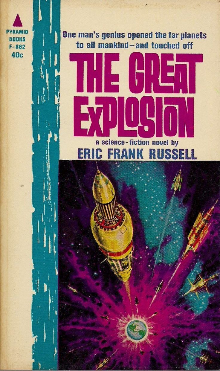 The Great Explosion is a SF comedy, an expansion of the author’s amusing “And Then There Were None” (1951). The plot is straightforward: a ship with hundreds of crewmen, soldiers, and government flunkies visit a series of planets and attempt to reunite them to the lovingkindness (a compound word translating to “rules and taxes”) of Earth. Shockingly, however, no one who left the Man behind on Earth is eager to see him come back — whether they’re criminals, nudist health freaks, or libertarians. Anyone who has had an ill experience with government functionaries — from IRS auditors to DMV clerks — will find vicarious amusement here, as a series of rebellious characters annoy, exasperate, obfuscate, and harass humorless G-men and their pompous, pot-bellied prince.