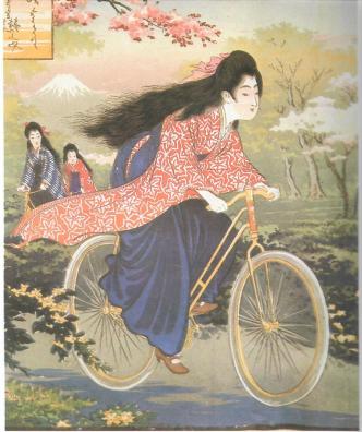In my “On the Horizon” post, I mentioned a print reproduced in an art history of Japan which depicted a woman in traditional dress riding a bicycle. The book mentions it only as a Yokohama print, with Fuji in the background.