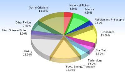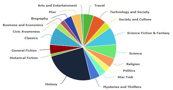 Every year I like to load up my books-read Excel list, sort it by labels, count everything up, and then make a chart out of it. Every year’s label sets are a little different, aside from old reliables like History and Science. Historical fiction is safe, too, even though it was waaaaaay down from previous years. Fiction in general was down, accounting for roughly 25% of what I read. I used Meta-Chart.com instead of Chartgo, and I’m pleased with the result, except for the font size. Right now to make it readable I’ve had to expand the chart so that it’s clipping into the sidebar.