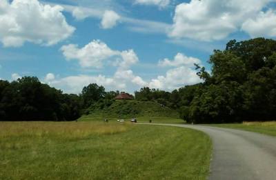 After entering the park at the visitor’s center in the left background of this photo, visitors will see them a wide field  dotted with grassy mounds, with a circular road connecting them. This photo is taken atop the largest mound, considered to be the chief’s by virtue of its size.