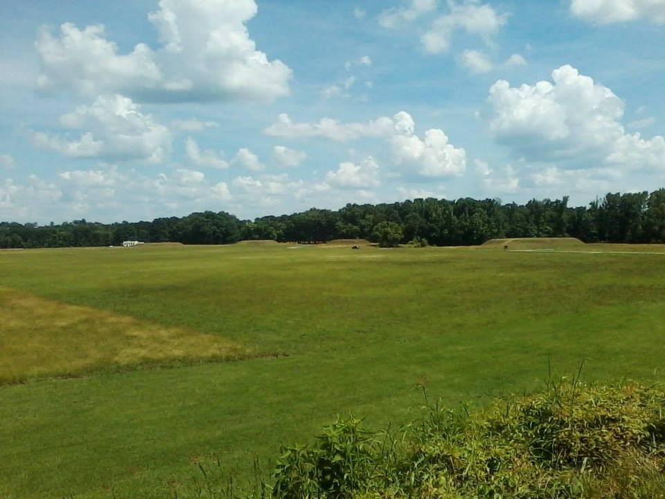 After entering the park at the visitor’s center in the left background of this photo, visitors will see them a wide field  dotted with grassy mounds, with a circular road connecting them. This photo is taken atop the largest mound, considered to be the chief’s by virtue of its size.