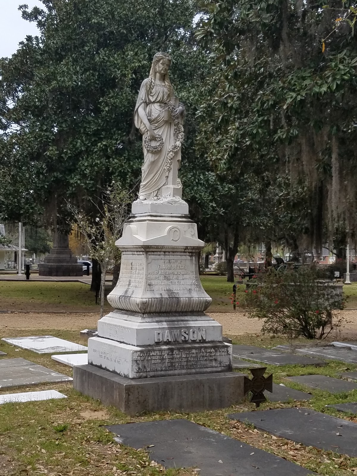 Elodie Todd Dawson, sister-in-law to Abe Lincoln, and partially responsible for the somber beauty that is Old Live Oak. She and her family purchased the land and organized its layout, with the pattern of oaks and magonlias that creates bountiful shade even in the summer. According to a local story, Elodie wore carefully-applied wax makeup and never stood or walked in direct sunlight — if she had to travel through it, she hiked up her skirts and double-timed her way into the shade. This was called “Elodie’s Walk”. Her husband commissioned a memorial statue of her for $7000 after death, disliked the hair, and commissioned another for $5000 more.