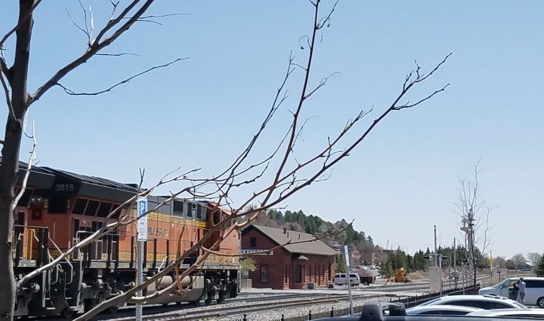 Aww, poor original depot. Passing it is one of the one hundred and sixty BNSF trains that roll through Flagstaff every day, mostly carrying shipping containers from Los Angeles.