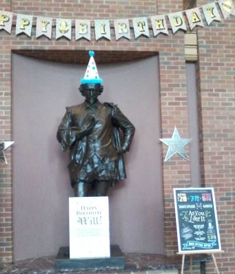 I’m a regular irregular patron of the Alabama Shakespeare Festival, a theater in Montgomery which always includes a few of the Bard’s works in their annual production season. In the foyer of the theater stands a statue of Shakespeare, and the Festival staff like to have fun with him by dressing him up throughout the year. The usual decor in April is, of course, a birthday hat. Shakespeare died on April 23rd, and tradition holds that he was born on that date as well. (His baptism on the 25th of April is known for certain.)