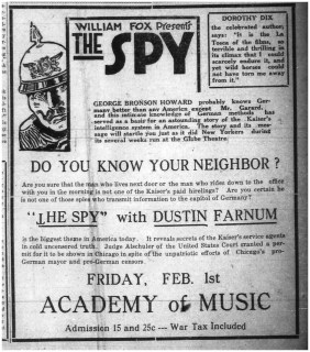 Somehow I doubt that this will be a reasonable and fact-based biopic. The Academy of Music, the oddly-named theater downtown, ran new shows seemingly every day in the period I searched. Admittedly, this is 1918 and production/postproduction time aren’t nearly as elaborate as they are today. Take a look at another: