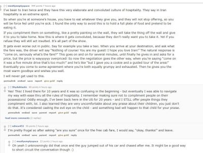 I recently shared a book called The Ayatollah Begs to Differ which covered the Iranian culture of hospitality. Oddly enough the same subject came on reddit, so I share it below for the curious. Click on the picture to expand..