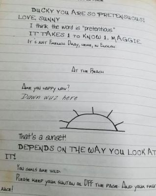 Each character’s “handwriting” is rendered in unique fonts, and each have distinctive ways of writing — Ducky writes his in the second-person perspective, Amalia writes into her book as if she were talking to someone named “Nbook”, and Maggie — the perfectionist — types hers, although readers still see her handwriting when she drafts and revises poems and song lyrics. (She has a line in the picture above, “I think the word is ‘pretentious'”. Maggie isn’t the only one whose creative talents are part of the journal: Amalia is an aspiring graphic artist and often illustrates scenes from her life. The series of fifteen books takes us through each person’s journals three times, beginning with Dawn, ending with Ducky, and then wrapping around again. (It’s not a bizarre coincidence that all five characters keep journals: their school requires it of students beginning in elementary classes.) The above picture is unusual in that it puts several characters’ handwriting in the same book: Ducky is driving to the beach and the girls are scribbling their greetings in his notebook. Only Amalia is missing, because ’72 Buicks only have so much room. Each of the fifteen diaries covers roughly a month or so.