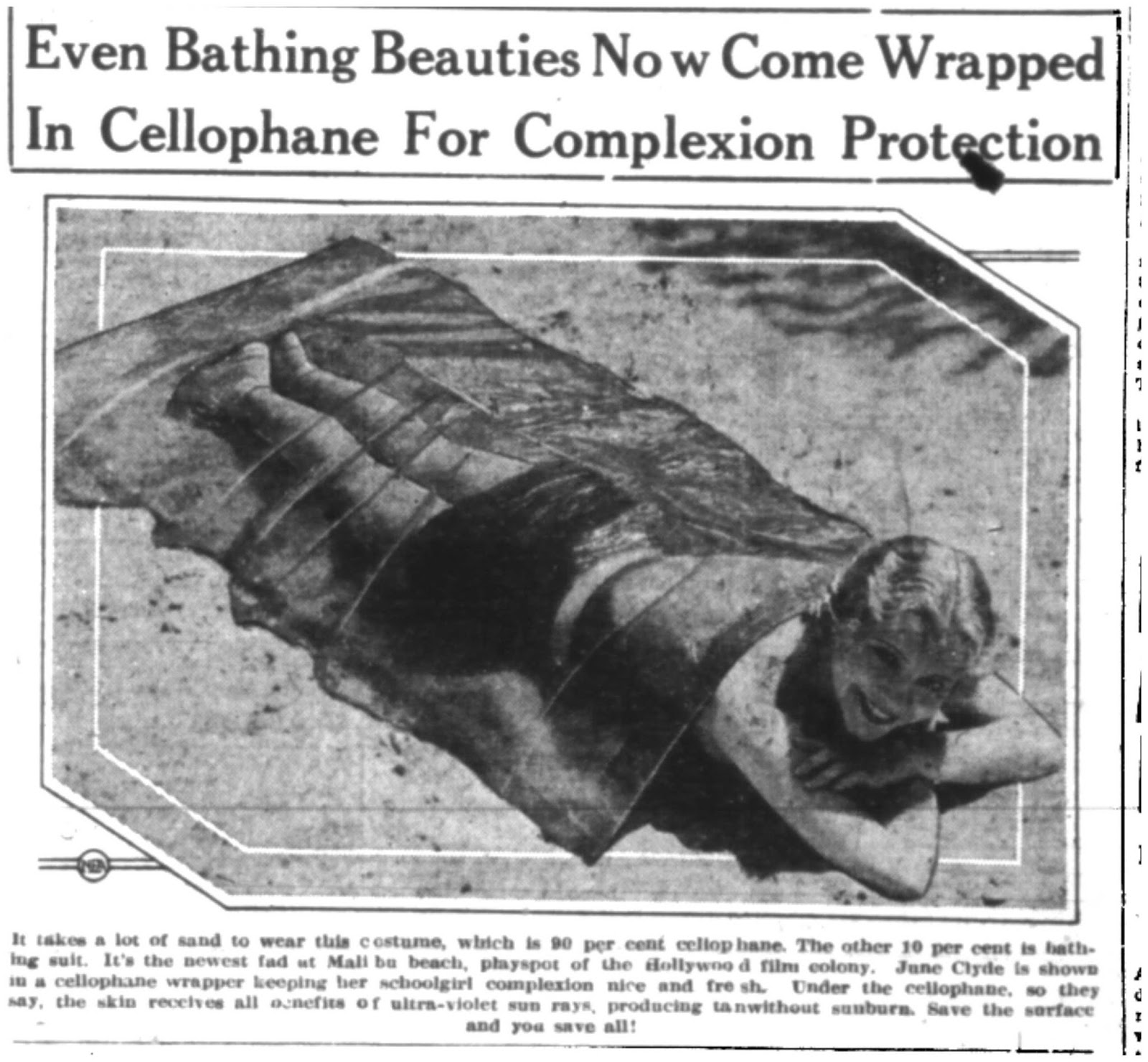 “It takes a lot of sand to wear this costume, which is 80 per cent cellophane. The other 10 percent is bathing suit. It’s the newest fad at Malibu beach, playspot of the Hollywood film colony. June Clyde is shown here is a cellophane wrapper keeping her schoolgirl complexion nice and fresh. Under the cellophane, so they say, the skin receives all the benefits of ultra-violent sun, producing tan without sunburn. Save the surface and you save all!”