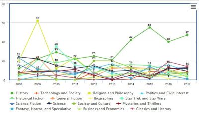 So, it turns out that turning ten years of book-reading data into a 15-item line graph is..kind of anti-climatic. Most of the items just kind of blend together, and the only things that leap out are (1) history’s uncontested place as the big kahuna; (2) that massive spike in religion and philosophy in 2009 that was never repeated; and (3), science’s slow descent and then recovery. That was something of a bust, so let’s look at something more…fun.