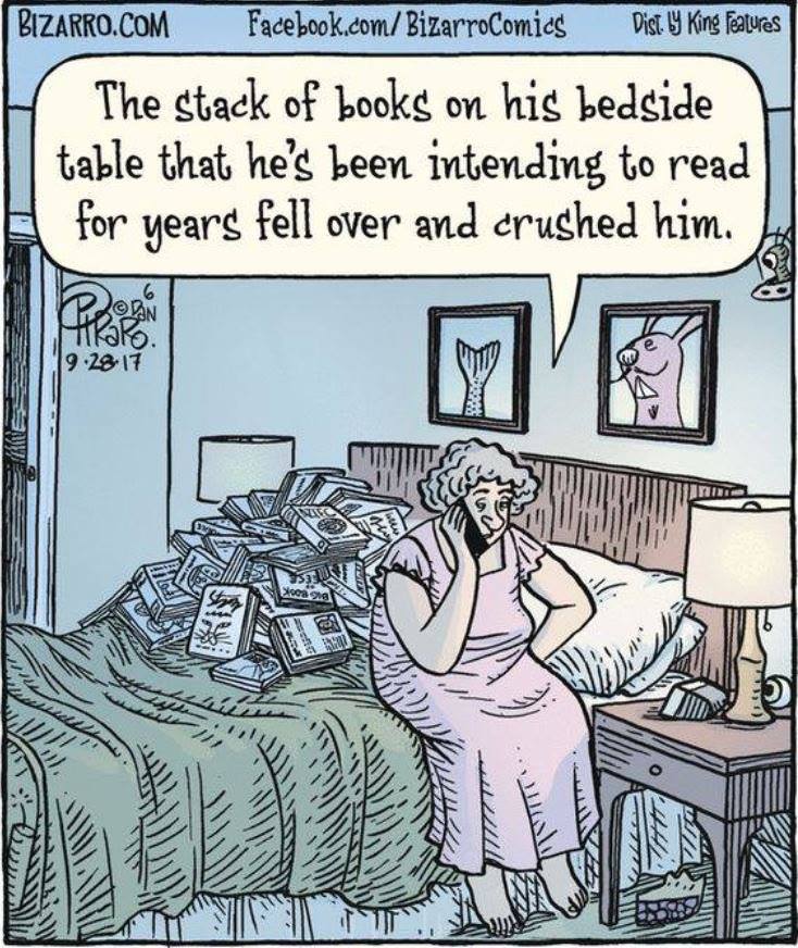 My bookish end will probably involve electrocution because of the faulty charger on my iPad, the source for all my reading. Zap! And so it goes….