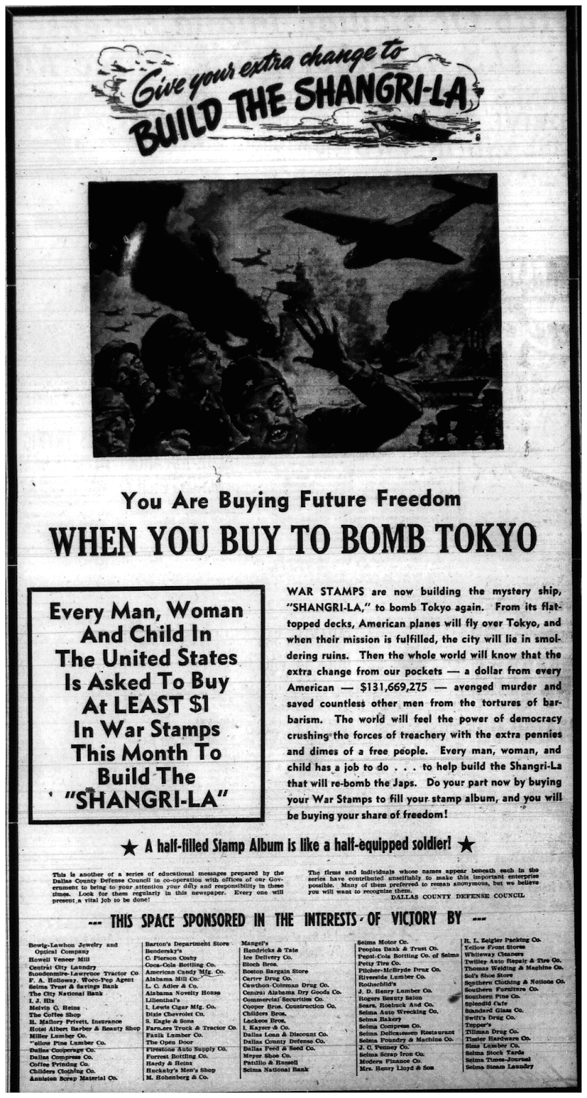 When the United States government formally announced that the Doolittle raid — a flight of B-17s over Tokyo in early 1942 — had been carried out, President Roosevelt informed a reporter that the bombers had been launched from a secret base in “Shangri-La”, an island from a novel popular at the time. I was thus intrigued to see this ad while searching for obituaries in 1943, encouraging Americans to buy stamps to support the building of the “mystery ship” Shangri-La. I assumed this was a codename, but it proves to have been the actual name: a USS Shangri-La was laid down in January 1943, completed in early ’44, and put into service in the autumn of that year. An Essex-class carrier, the ship participated in late-war bombing raids against the Japanese home islands, so this is a rare case of an advertisement getting fairly close to the mark. According to Wikipedia, the ship served through Vietnam, specializing in anti-submarine warfare, and was retired in 1974. Although I’m familiar with war bond campaigns, this is the first I’ve encountered where bonds or stamps were linked to a specific project, in this case a bonafide ship.