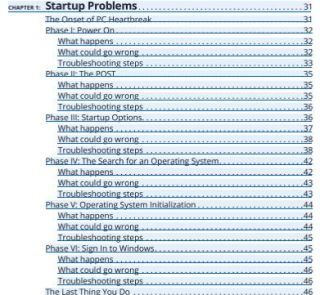The above shot is from the table of contents for Troubleshooting and Maintaining Your PC All in One For Dummies, 3rd Edition, not Troubleshooting Your PC for Dummies, 3rd Edition  As you can see, it’s a methodical walk-through of everything that happens during the startup sequence,  (I assume)  offers information on how to figure out if it’s bad RAM or a failing power supply or whatever.    The similarly titled but drastically book I’ve just read was far more basic,  explaining what common errors meant,  reviewing the proper method of uninstalling programs (instead of just deleting their files), running antivirus and system restores ,  guiding readers  to their Control Panel — helpful to beginners who  have never explored  beyond the desktop and their documents folders.