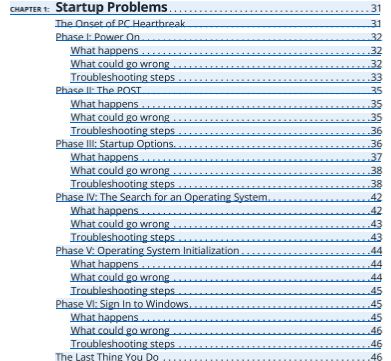 The above shot is from the table of contents for Troubleshooting and Maintaining Your PC All in One For Dummies, 3rd Edition, not Troubleshooting Your PC for Dummies, 3rd Edition  As you can see, it’s a methodical walk-through of everything that happens during the startup sequence,  (I assume)  offers information on how to figure out if it’s bad RAM or a failing power supply or whatever.    The similarly titled but drastically book I’ve just read was far more basic,  explaining what common errors meant,  reviewing the proper method of uninstalling programs (instead of just deleting their files), running antivirus and system restores ,  guiding readers  to their Control Panel — helpful to beginners who  have never explored  beyond the desktop and their documents folders.