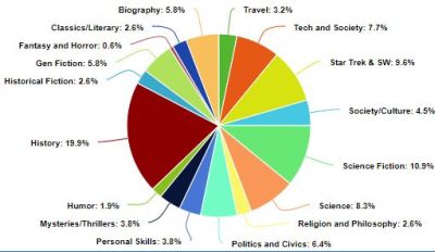 As usual, nonfiction predominates, totaling 64% this year which is right in line with my usual average. History, Science, and Technology were the leaders there. Ebooks came in strong this year, accounting for 44% of my reading. When I converted all of my booklists into Excel and imposed a uniform categorization, I noticed that female authors were….scarce, usually under 10% of my reading. This year I had an unannounced goal of reading more female authors, and consider the 22% they managed to be an improvement.