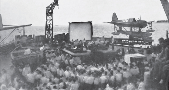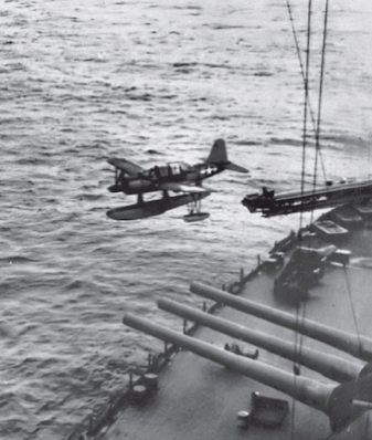 One of the two Kingfisher planes being launched by catapult. These were used for artillery spotting and for search and rescue operations.