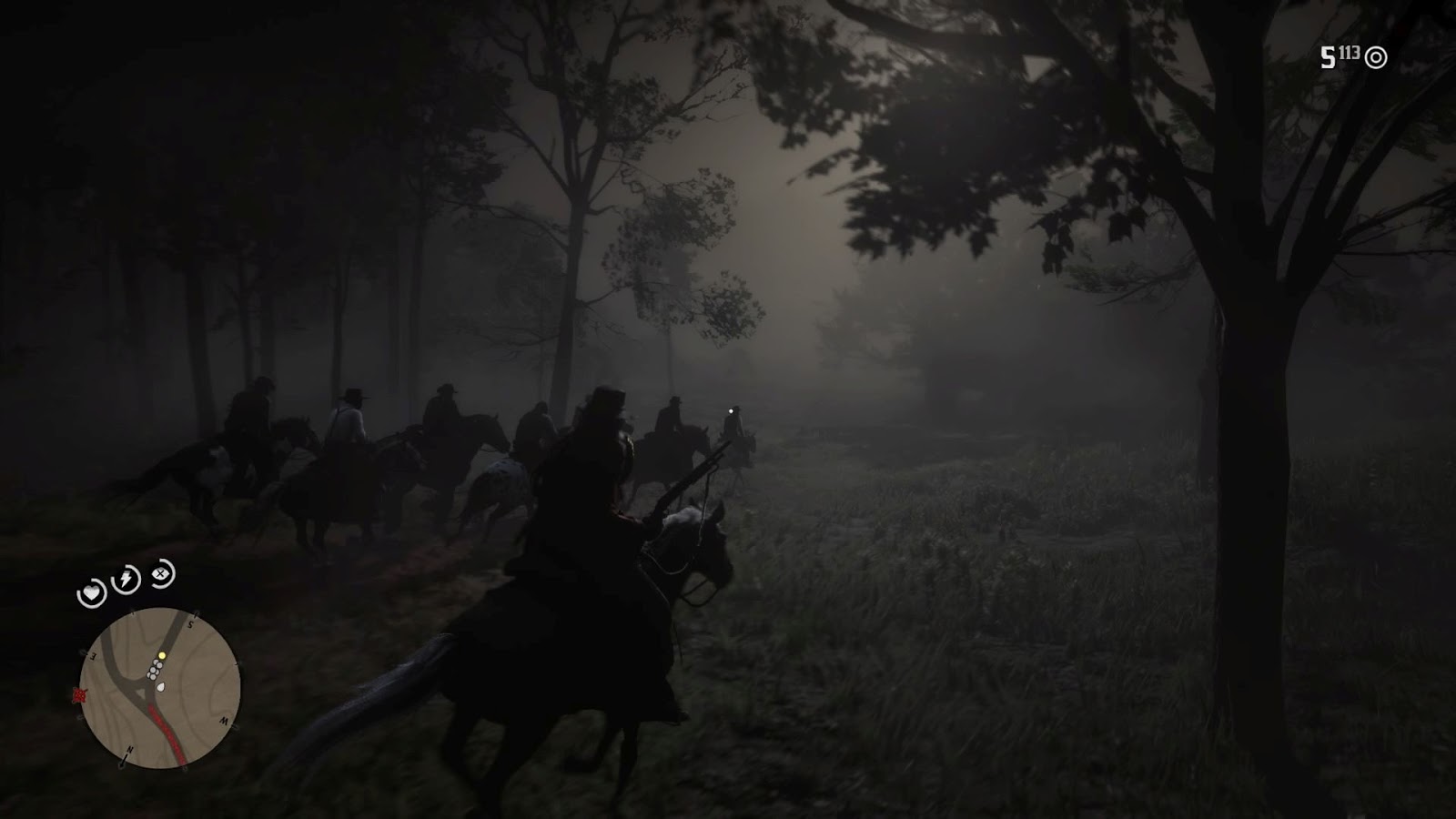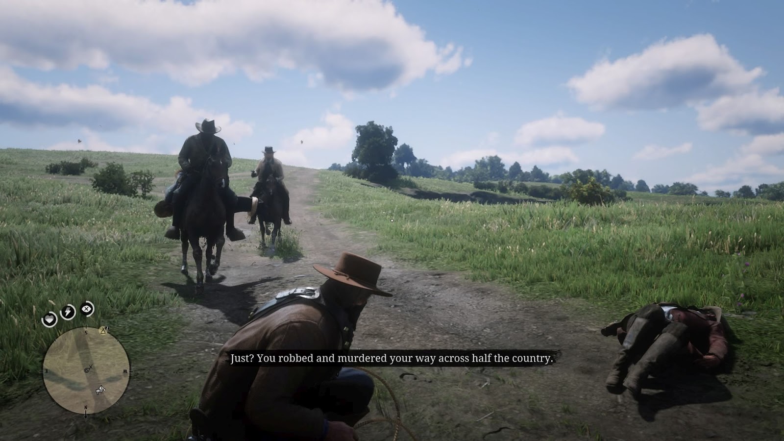 The player is not the only resident of these lands capable of getting up to mischief:   there are other gangs who operate in different areas of the map who will ambush unsuspecting travelers, and if they are resisted — as I did, with dynamite and a sawed-off  —   they develop a special hatred toward the player and will deliberately target them.  It didn’t take me long to start traveling with my sawed-off at the ready, and with a wary eye casing the road ahead, looking for spots where I might get ambushed.  I often went off-road to avoid areas with a hill or  large rocks beside the road,  and when I needed to travel across a high-risk area like a covered bridge, I did so at full gallop ready to rain shot on anyone.   Other travelers are likewise cautious, and if you follow too closely they will draw on you.