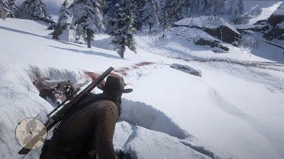 The game’s weather system, and the constantly changing lighting effects, allow for still more experiences: the bayou is  a very different place at night, or when there’s a thunderstorm rolling through. The game’s cargo system allows players to store clothing on their horse, so if needed they can don a heavy overcoat when headed into mountain country, or strip down to just a shirt while moving through the bayou. The landscape changes with the weather; snow falls, puddles develop in wagon-wheel ruts.  I have not yet stopped goggling at the clear imprint made by a rolling wagon, or footprints, or a bloody trail left in the snow by a stricken animal.