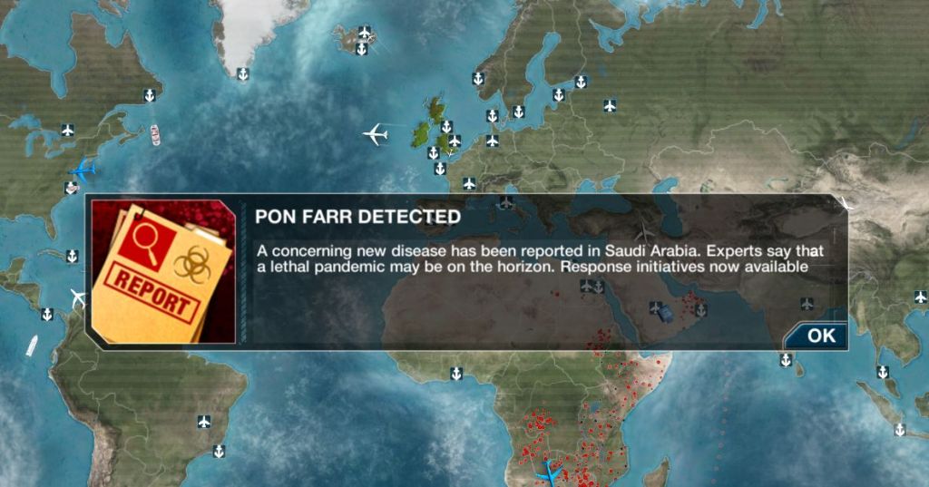 Part of the game unfolds as one is used to: tiny red dots slowly fill the globe as a disease breaks out and spreads across the planet, following the lines of transit. This time, though, instead of guiding the plague to different symptoms and increasing potential vectors, the player attempts to thwart the virus by building a response network, imposing quarantines, educating the populace, expanding treatment options, etc. Strong quarantines are an option, but they can backfire just like strong symptoms do in the regular game mode, provoking a counter-response: this time, populaces can start not-complying, and they’ll do so even as the country is collapsing around them from the dead. So far I’ve played five games and…failed 4/5ths of them.