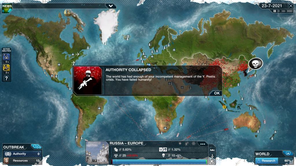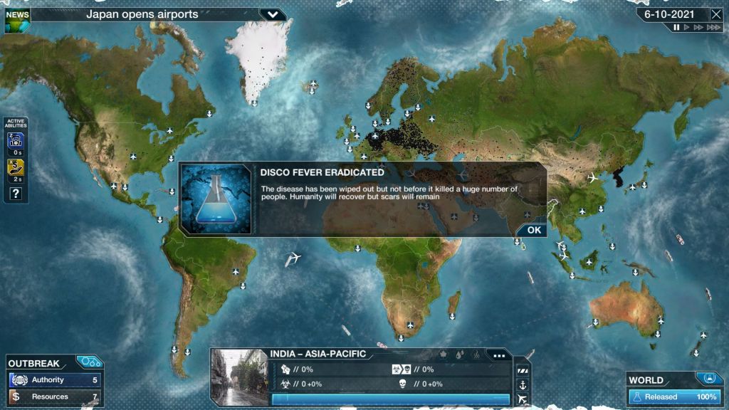 My first attempt was oddly the most effective, despite my not knowing what I was doing: I didn’t even know how to access tools until the game yelled at me to do something before it was too late, and I was slow to explore the various options, so by the time 93 million people were dead, I’d slowly woken up to the fact and and was starting to issue vague announcements that people should you know, wash their hands and stuff. Eventually the plague spread too far and killed too many and I was fired. But hey, we had a vaccine and it was just about to start being distributed!