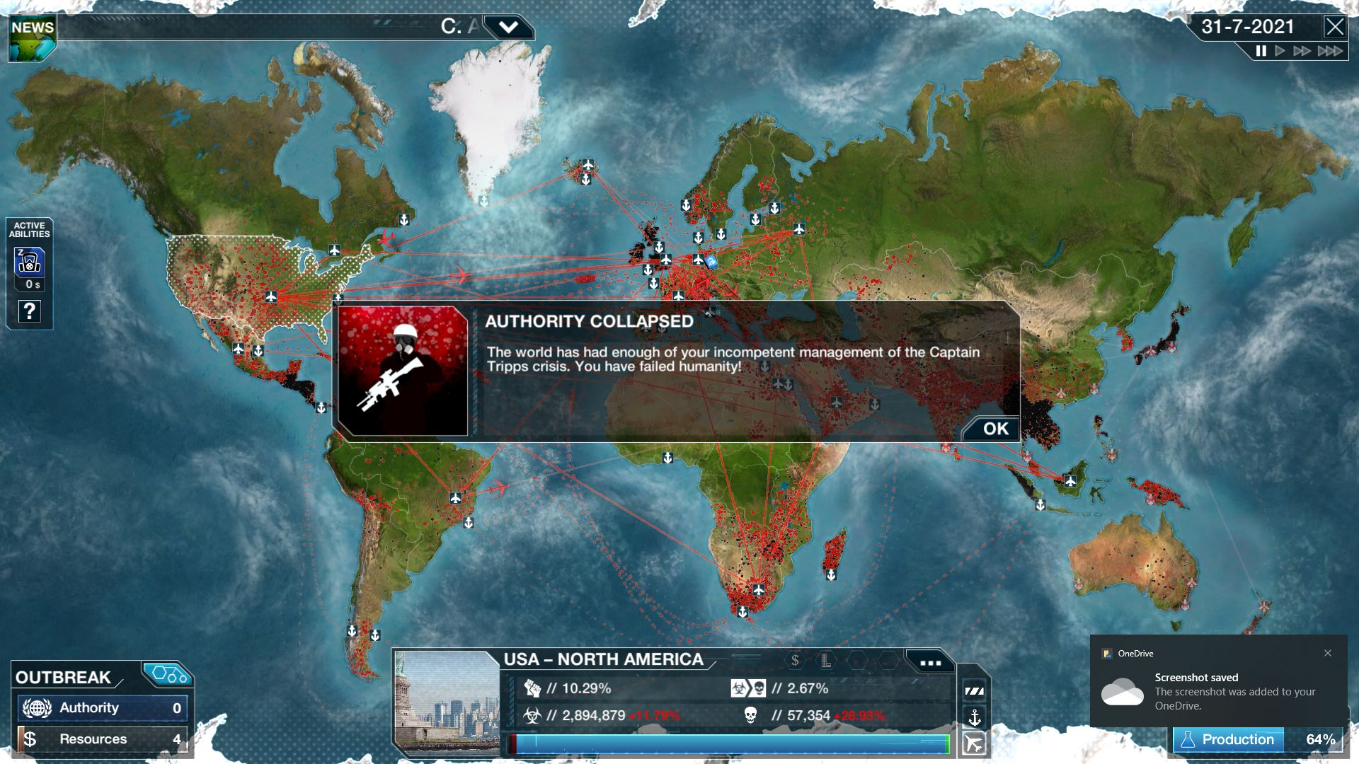Finally, on my fourth attempt, I managed to not get fired long enough to see the vaccine finished, manufactured, and distributed. It was a close-run thing: I got all the way down to 2% authority before I imposed censorship to stop people from complaining. Those wicked Canadians broke the gag order, but by that time I’d already started shipping vaccines and my authority rose.