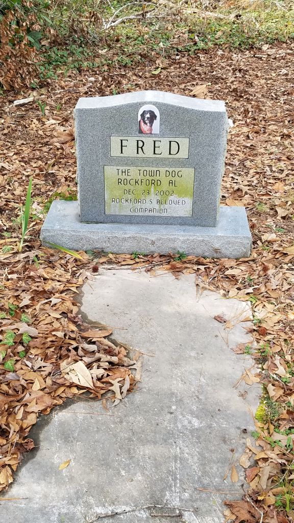 In eastern Alabama, I paid a visit to Rockford to see its old jailhouse, built entirely of rock; and to pay my respects to Fred the Town Dog. I was told he was buried near the rock jail, but I only found a sidewalk leading to a tree stump and a pile of stones. Possibly a grave, but surely Fred the Town Dog had a placard, at least. He was Fred the Town Dog, appearing in Christmas Tales of Alabama and an Animal Planet special! After wandering around downtown Rockford chatting with people, I found someone in the post office who knew exactly where Fred was.