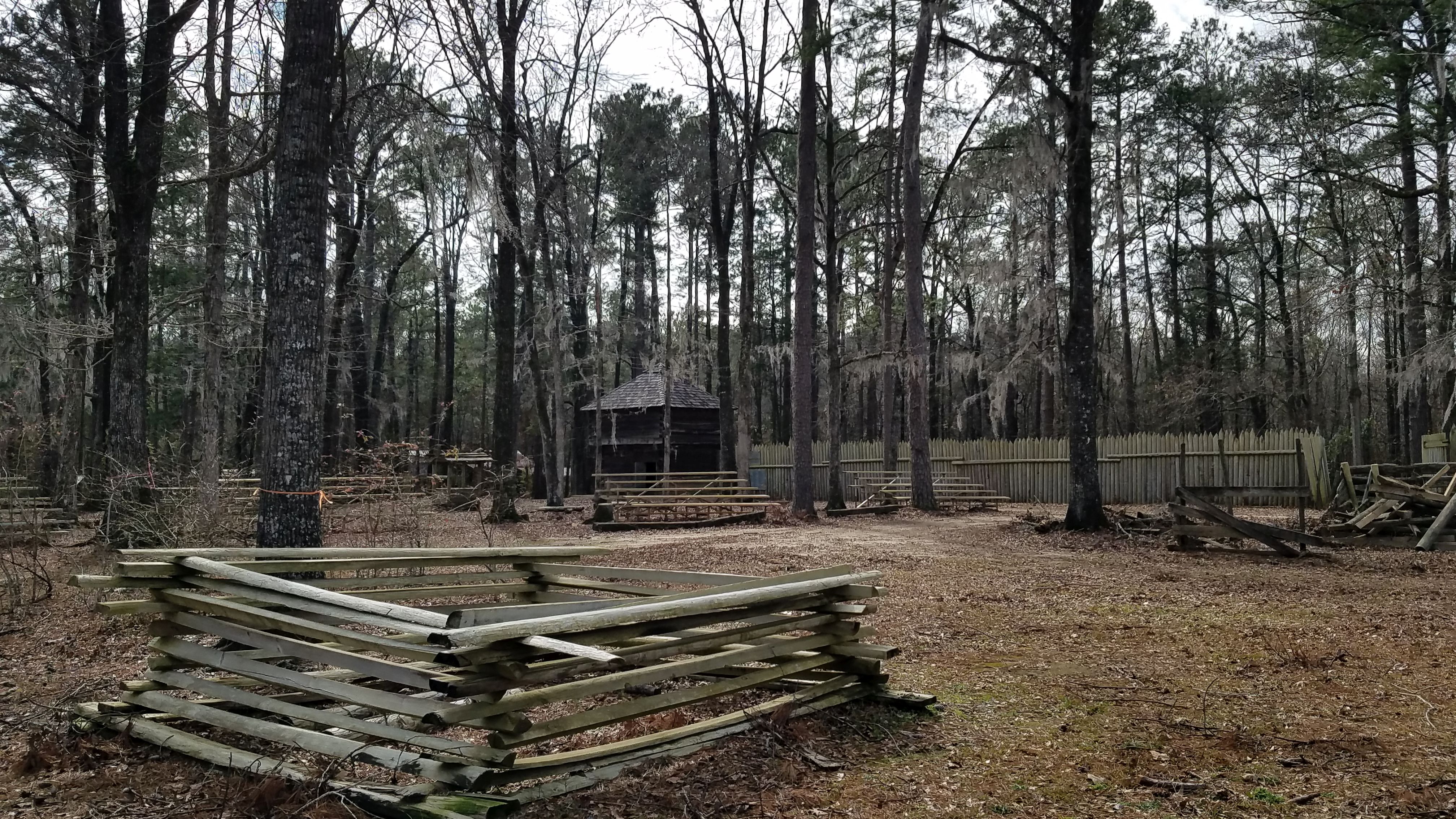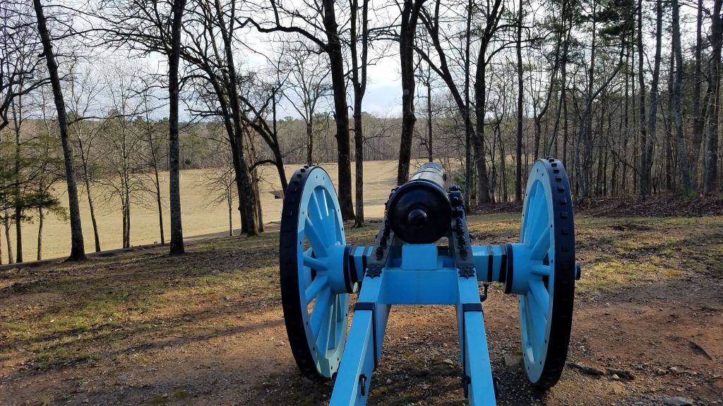 Through the trees there’s a series of white posts; that’s where the Red Sticks had their barricade. American cannons were painted blue in honor of the French practice.