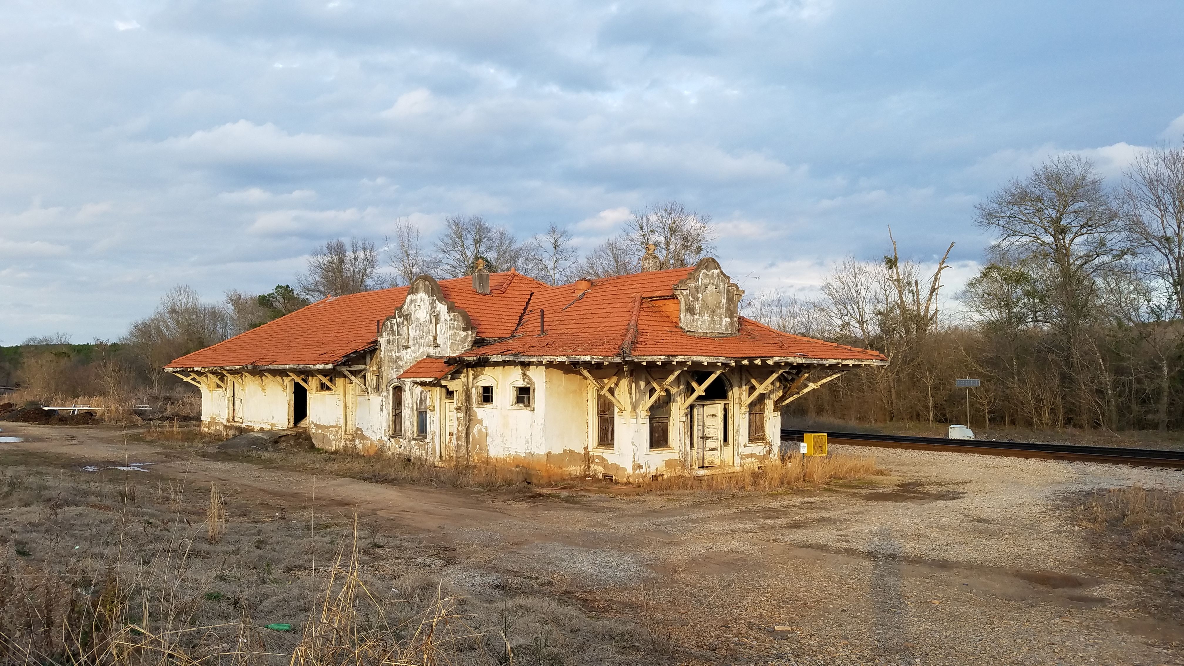 Much further east is the small town of Wadley, which I reached late in the afternoon after exploring Horseshoe Bend. I went there to see one of Alabama’s four extant Mission Revival train stations. Judging by appearances there may soon be only three extant Mission Revival train stations in the state. The inside looked rather junked up; I was curious but didn’t have a flashlight or company, so I decided not to tempt fate.