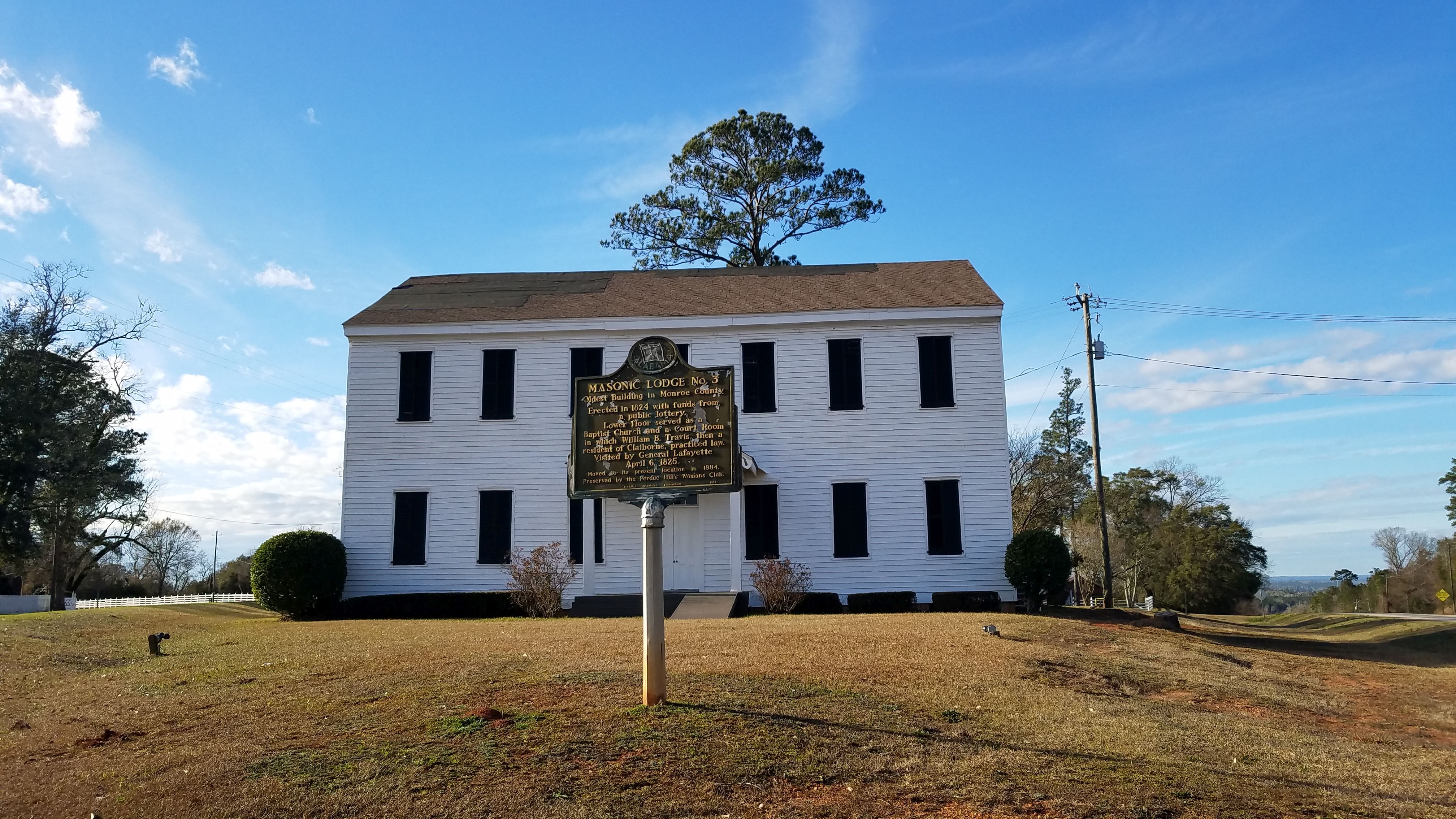 The fort itself is no more; only a sign in a lot not far from the river bears witness to its existance. The battle at Holy Ground took place midway between Selma and Montgomery; it was there that one of the Redsticks’ more flamboyant leaders allegedly drove his horse over a ridge into the water to escape. Not far from the Claiborne signpost is a Masonic lodge, the oldest building in Monroe County and possibly once part of the town.