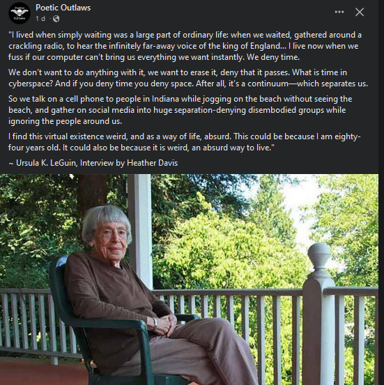 I really get what she’s saying but… as someone who has spent a great deal of time in the present with “the people around me,” I’ve reached a point I find isolation IRL is worse than the long-distance community she’s describing. Probably there is a balance between the two extremes that is to be aimed for. But there is a reason even people in the past were known for their lengthy (both geographically and verbally) correspondence and letter-writing took up a great portion of their days.