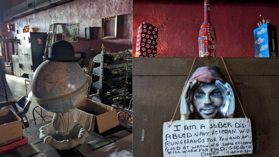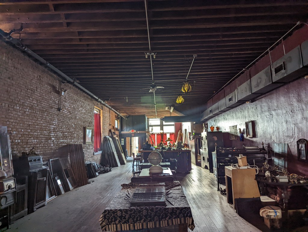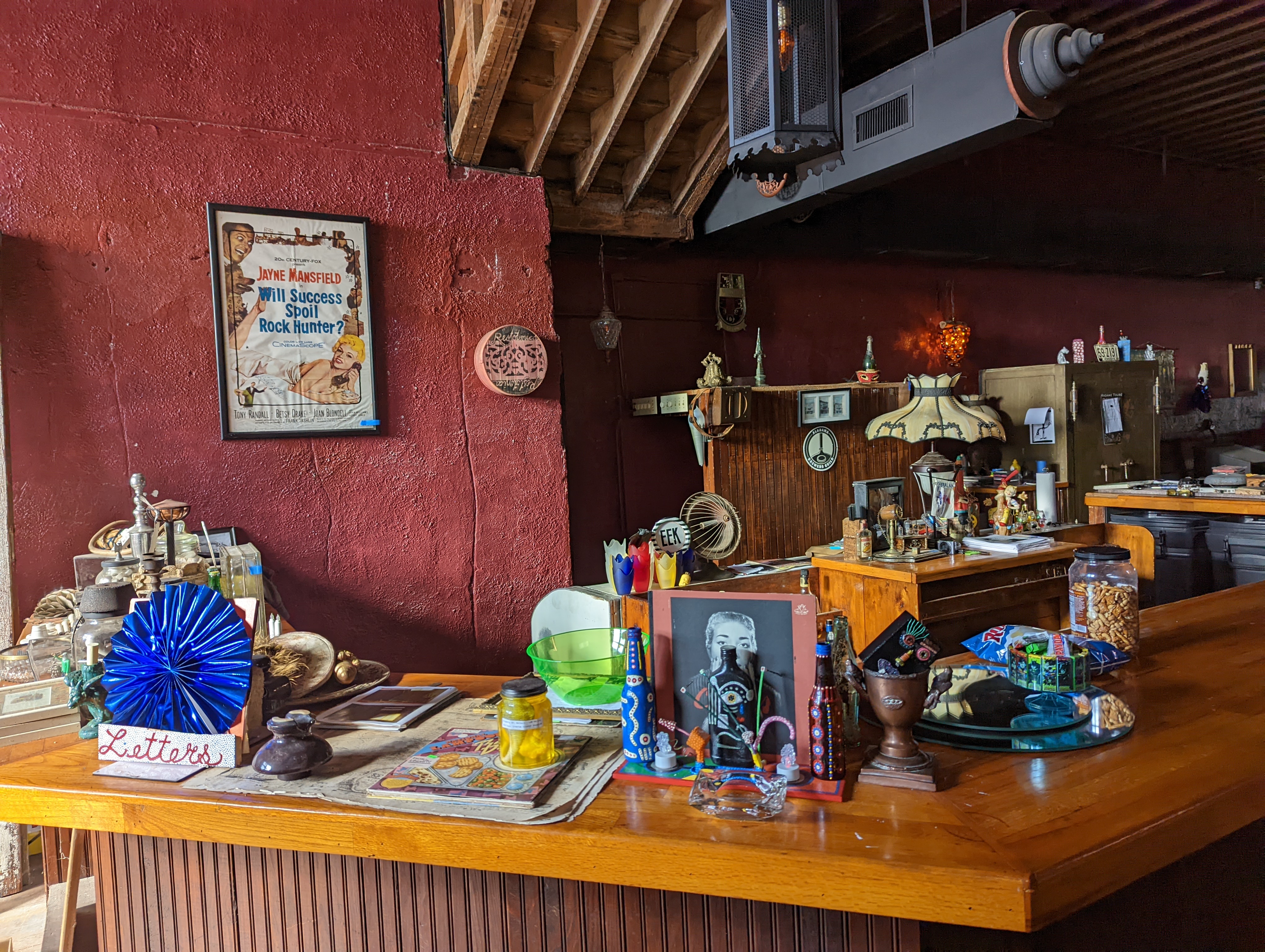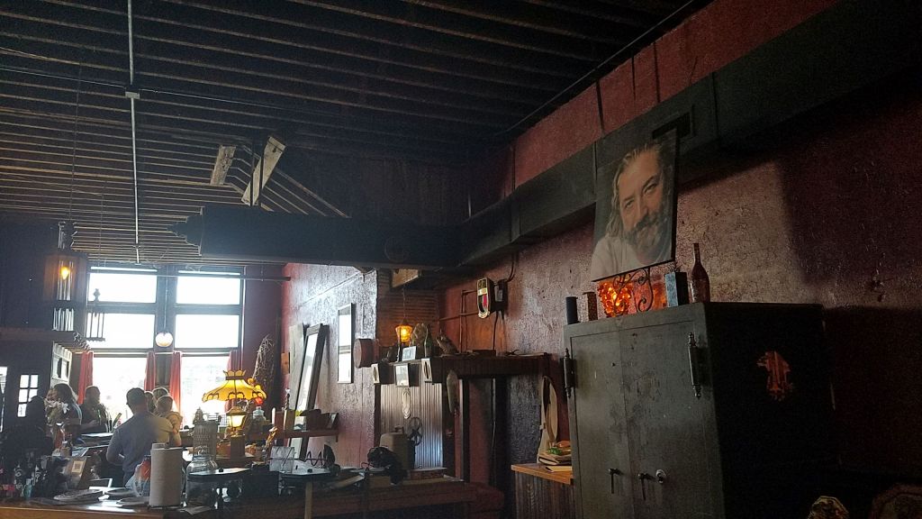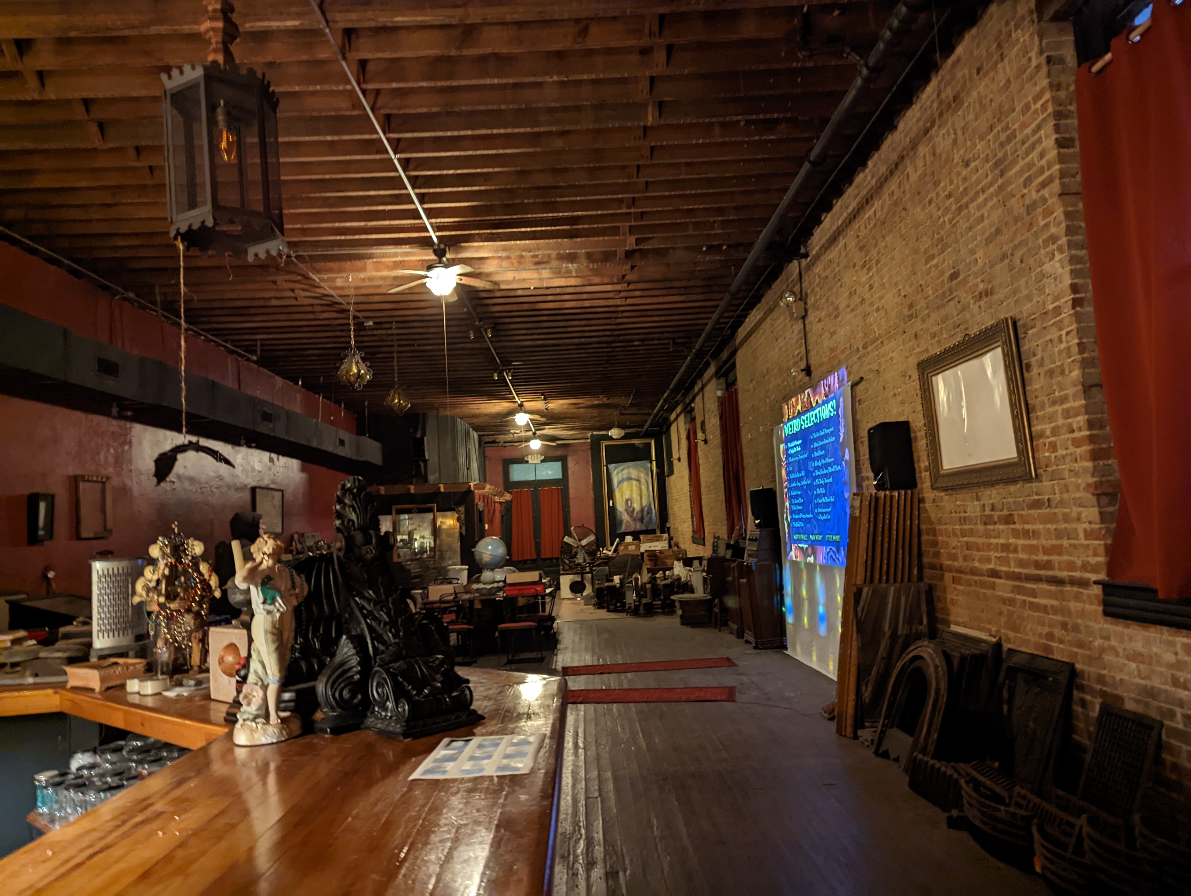It’s impossible to succinctly describe the sheer variety of stuff in that room, which used to be packed with oddities. To be found there were old toilets, sinks, doors, and pillars – but also X-ray machines used by shoe stores who used them for sizing fits, and first-generation television sets, along with more expected antique items like older chairs, tables, and lamps. David bought and sold these antiques on the side as his private passion; they were ‘beer money’, as he exclaimed whenever he made a sale. The space, big as it was, was filled with these elements – but there were also the oddities, as he was passionate about art and made his own ‘steampunk’ pieces, in addition to occasionally showcasing pieces from local artists. These showings gave life to an official organization, ArtsRevive, which acquired its own building – but the HC continued to collect and show more eccentric pieces. These pieces and the place’s general decor make it a place unlike any other, and over the years I’ve grown to genuinely love it as a physical place, even aside from the good times I’ve had inside: its bizarre collection of found-and-created articles, of random decor, slowly grew over time into an ever-changing but reliably weird mosaic of space. When I began looking through my photos to find some appropriate ones to share here, I was amused by the multitude I’d taken, and of areas that aren’t picturesque, like the exposed ceiling beams made of old-growth oak. The bar area has this unique feel to it: the brick, old wood, and dark interior always make me think of an old-fashioned men’s bar, but the random furniture and crazy art put a light twist on a space that might have seemed intimidating otherwise. Especially dear were the oddities that had stories connected with them: a strange sign employed in a prank from fifteen years ago, for instance, or a petit four box decorated with Jane Mansfield.