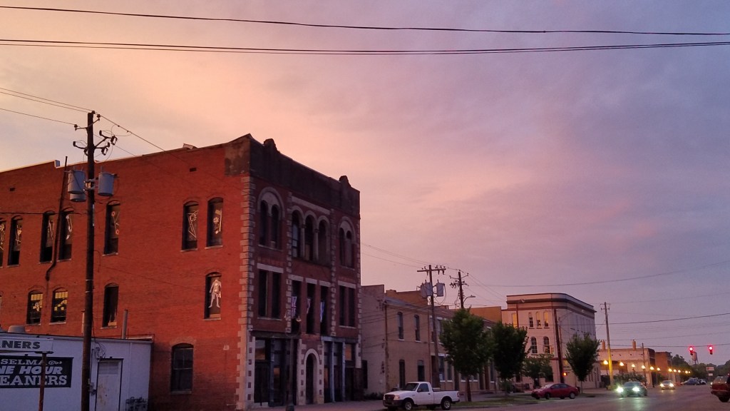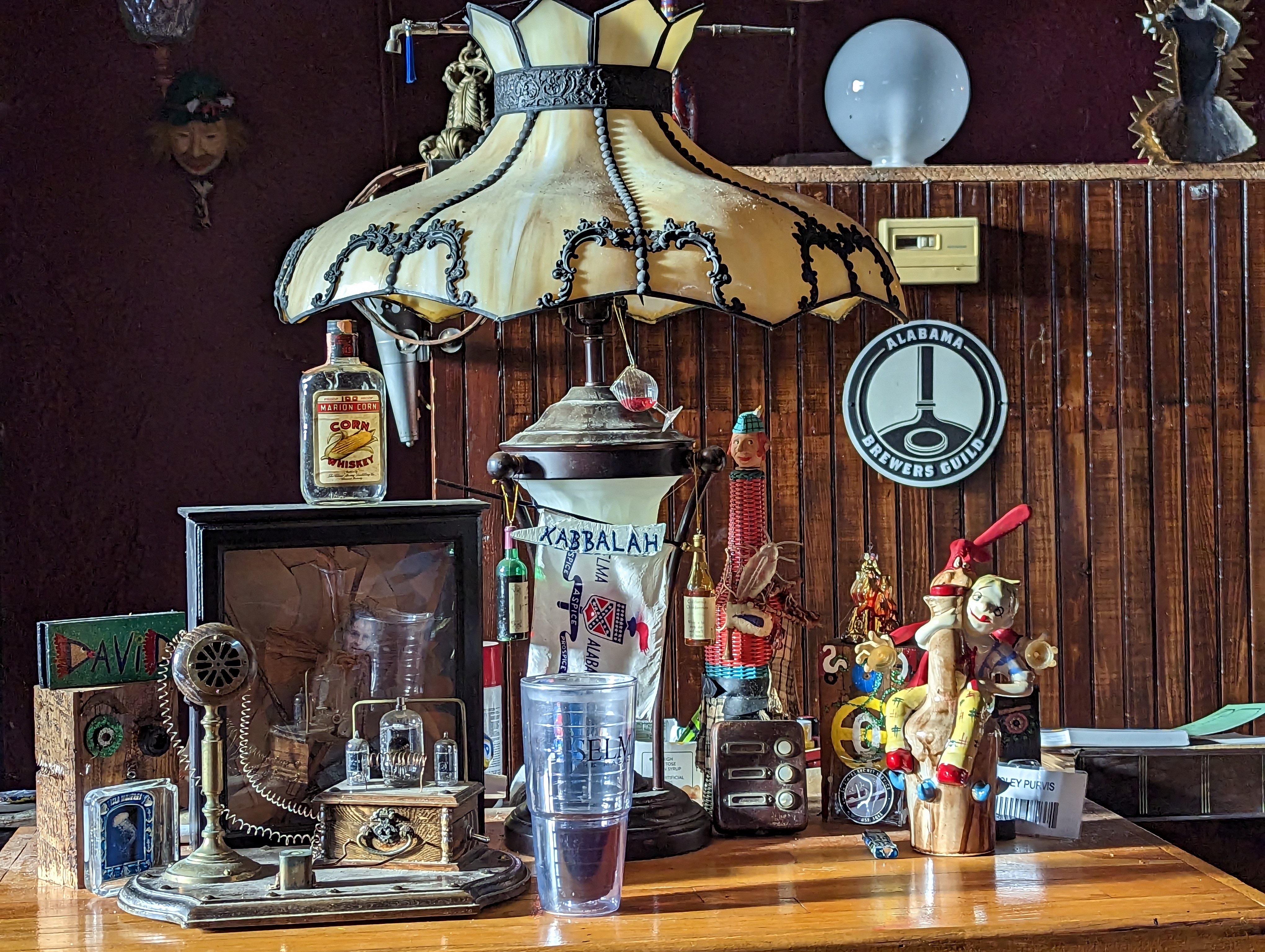 The bar-turned-showroom, which David called Restotonica, occupied the left side of the HC’s first story. The right side, separated from Restotonica by a staircase and walls, was rented by several restaurants, the last of which was Charlie’s Place. David developed the habit of sitting outside the Harmony Club and yakking with tourists or visitors to the restaurants, sharing facts about Selma history or architecture, and inviting them in to take a look at his antiques. David’s friends often joined him at this, and it became a salon of sorts – a weekend drinking-and-yakking circle, where people of all kinds would stop and talk. This made it a refuge for me in 2020: when everything else was closed, the Sidewalk was open. The Sidewalk gang had its regulars and semiregulars, though the circle grew smaller and closer after David died in early 2022. He’d sold the building not long before, though the closing was a year away – so the Sidewalk has continued meeting in his honor, and by the grace of the building’s new owners and David’s last roommate, who has been the building’s steward in its last year or so. I’ve spent many a happy hour outside or inside – enjoying breakfast with friends on Saturday mornings, watching movies on Wednesday nights, or just holding down a bar stool on Friday and Saturday nights and yakking with whomever comes in while listening to music from across the world. We’ve watched parades and drunken karaoke across the street, gotten to know Secret Service agents who’d pop in for a chat during a visit from DC , watched brilliant sunsets, bizarre traffic and pedestrian goings-on, and sent off a flying lantern in memory of our departed. I don’t know when we’ll watch our last movie, share our last meal, or use the bottle-openers David screwed onto the utility pole for the last time, but I intend to savor every moment that I can until the Sidewalk closes for good. The building’s new owners intend to complete David’s twenty years of restoration work, culminating in the recreation of the old covered balcony. If that happens, I’ll be all the happier for Selma, and for David’s memory: he’d beam to see it, I’m sure. However glorious it turns out, though, I suspect part of me will always want to come back to the Sidewalk and the long bar as I knew it — this crazy, colorful, intimate and storied spot where I rode out hurricanes and heartaches, celebrated birthdays, and heard too many wonderful stories to remember.