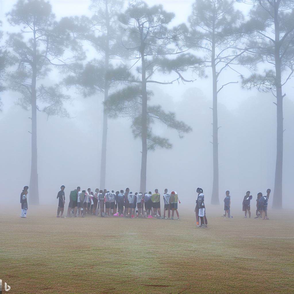 Image by Microsoft Image Creator. Prompt: “A fog-shrouded field surrounded by longleaf pine forest, where a group of 20 high school students are lined up to play football.”