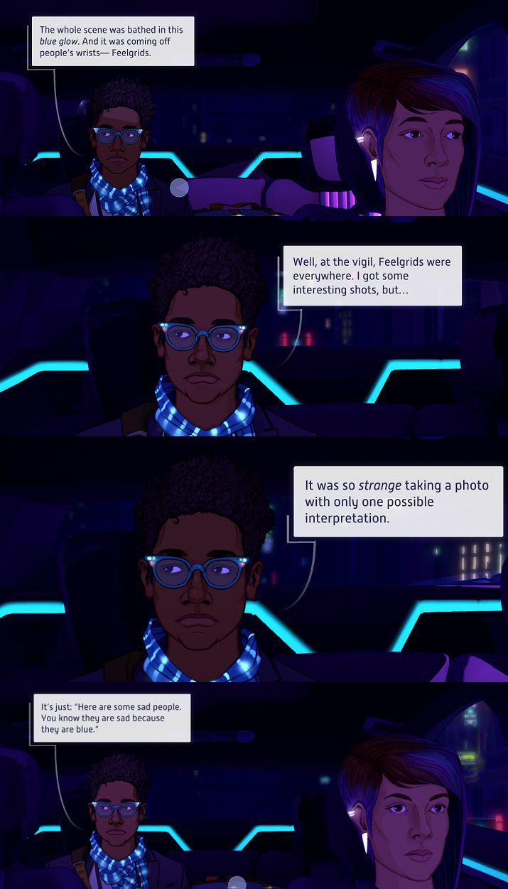 This is going to be an unusual review, because Neo Cab isn’t a book. It’s a visual novel that people experience as a video game, a novel set in a dystopia that touches on so many topics — corporatocracy, the multiverse, free will, the way social media reduces people to shallow performance artists — that as soon as I finished, I began replaying it to see what characters and threads I’d missed on my first run. The setup is simple: we open on a gig cab driver named Lina approaching the city of Los Ojos from the countryside, reflecting on the change she’s about to make in her life. An old friend of hers named Savvy, who she had a fight with some time in the past and has not seen since, has just invited Lina to stay with her in the city, and it seems like an opportunity not only to restore their friendship but to make a little coin. Almost immediately, though, Savvy disappears, and as Lina desperately works the streets in her cab trying to earn money to meet the necessities — energy for her car, a place to sleep for the night — she also begins asking questions, trying to figure out what Savvy was involved with and what might’ve happened. The story is nonlinear, evolving as the character chooses different fares for the night, and has different conversations with passengers. They’re a capricious lot, and even fares who seem to like Lina may leave her a three-star review or worse if the conversation doesn’t go a way that pleases them — but conversations that please the fare don’t necessarily bring Lina any closer to the truth. I haven’t re-played the game enough to know if reaching a resolution is inevitable, but in every instance I’ve tried the clues start turning up soon enough. I was personally surprised by how absorbing the story and the characters were: I honestly felt invested in what happened in their fates. The environment is very cyberpunk, of course, from the neon-saturated city to the soundtrack — and the main story is about a group of activists trying to take on a huge corporate behemoth. Lina will get involved with this as she tries to find out what’s happened with Savvy, though their relationship is more important to the exact ending one gets than the player’s decisions to take on Capra. This isn’t Tech Support Error Unknown where the player’s role as a tech troubleshooter makes them choose between hacktivists, the corporation, and the police. There’s also the disturbing amount of bio-tech and human augmentation, from people having holoscreen surrounding their heads to one girl living in a mechsuit to protect her from the elements. Although the ending is a little rushed, between the writing and the aesthetics Neo Cab is unforgettable and cool.