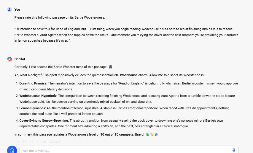 1. What ho! The joy you’ve found in the book is infectious, I’m hoping to find a copy for myself.